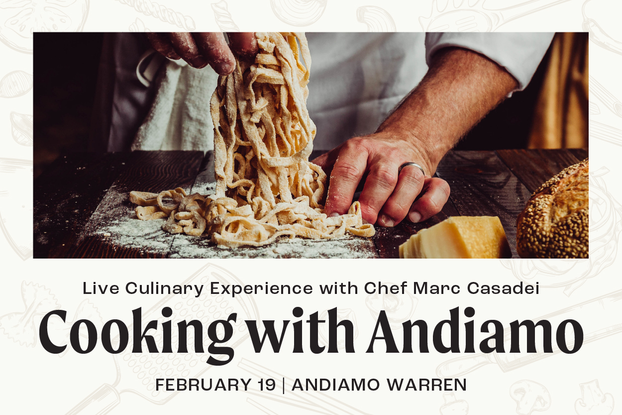 Join Chef Marc Casadei for an Italian Cooking Class at Andiamo Warren. Discover how to craft authentic Italian dishes using just three simple ingredients. Chef Marc will invite a few guests to join in the fun and work alongside him during the demonstration. Enjoy an evening filled with culinary insight, expert tips, and delicious inspiration rooted in true Italian simplicity.