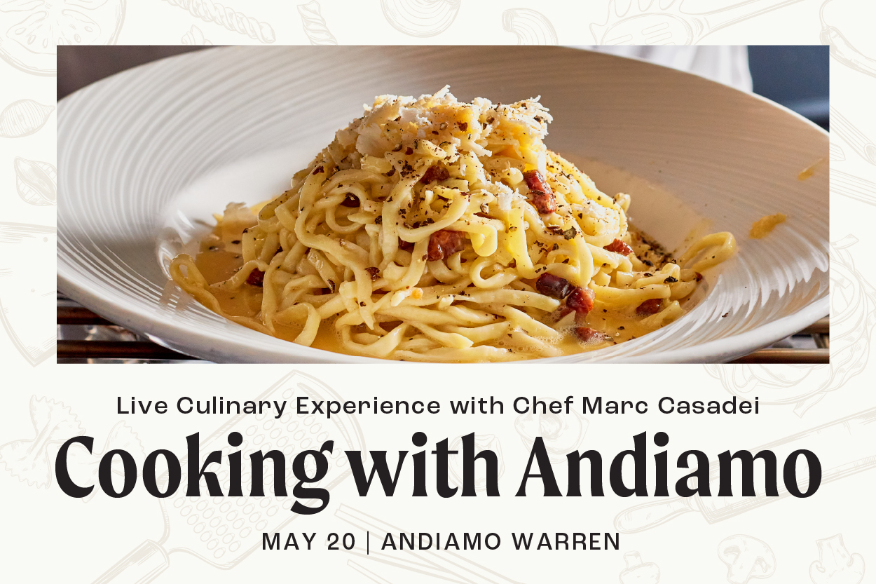 Join Chef Marc Casadei for an Italian cooking experience at Andiamo Warren. Discover how to craft authentic Italian dishes using just three simple ingredients, while learning the techniques and philosophy behind true Italian simplicity.