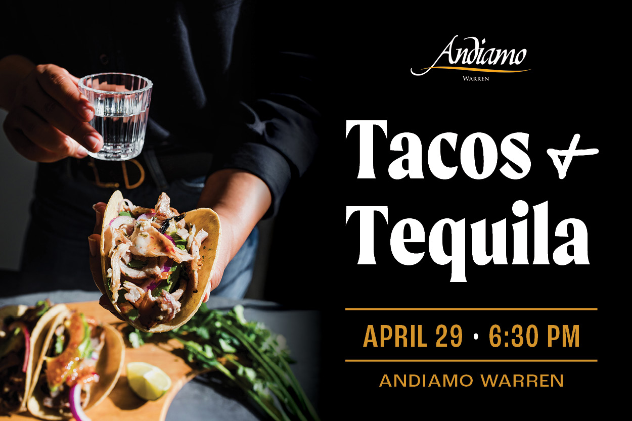 Sip and savor four premium tequilas paired with chef-crafted tacos at Andiamo Warren as tequila expert Nick Bontomasi of Benchmark guides each course through a curated tasting experience. Featuring standout pours including Day Dreamer Reposado, Padre Azul Single & Double Barrel, and Amor Mío Añejo. Every guest will also receive a keepsake gift to commemorate the evening.